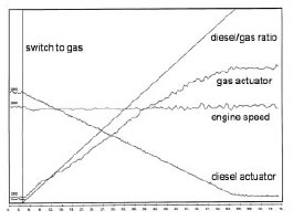 By means of camshaft and flywheel sensors the injection is accurately timed to begin only after the corresponding inlet valve has opened and exhaust valve has closed. The system therefore does not expose the engine intake system, turbocharger or hot exhaust to a combustible gas air mixture and therefore promotes the highest levels of safety. Also, because the gas fuel is injected close to the cylinders, the quality of governing of the engine is maintained at a similar level to that experienced when running with diesel fuel only. The amount of gas injected is controlled by the duration the of the MEGASOLs opening during each injection. Gas flow rate is substantially constant during the injection period which ensures the quantity of gas injected is proportional to the time the MEGASOLs are open. It also allows each cylinder to be individually controlled and allows the engine to be balanced correctly - usually by exhaust temperature monitoring.